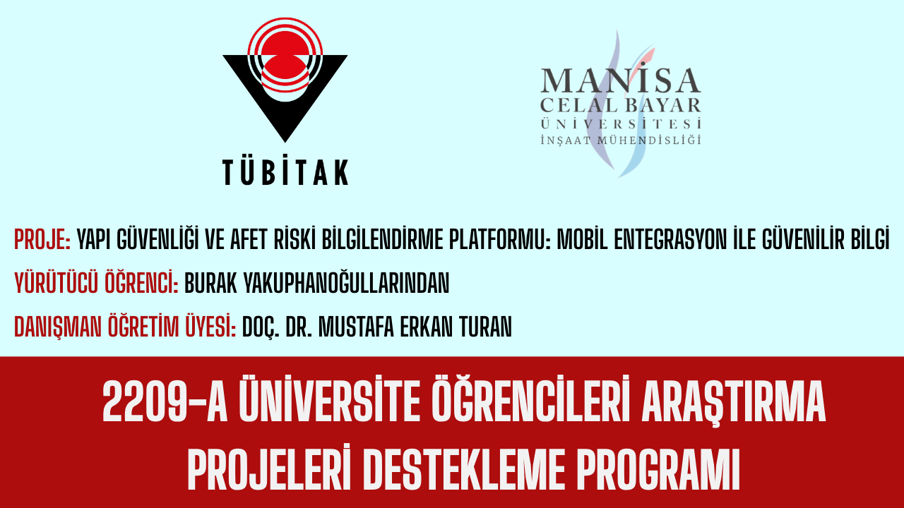 TÜBİTAK 2209-A Üniversite Öğrencileri Araştırma Projeleri Destekleme Programı kapsamında bölümümüzden 3 proje kabul edildi.Proje: Yapı Güvenliği Ve Afet Riski Bilgilendirme Platformu: Mobil Entegrasyon İle Güvenilir BilgiYürütücü Öğrenci: Burak YAKUPHANOĞULLARINDANDanışman Öğretim Üyesi: Doç. Dr. Mustafa Erkan TURANProje: Üniversite Öğrencileriyle Kampüs Ortamında 'Suyun İzinde Sürdürülebilirlik Topluluğu' İle Suyun Sürdürülebilirliği Konusunda Farkındalık ÇalışmasıYürütücü Öğrenci: Cansın GÜRBÜZDanışman Öğretim Üyesi: Doç. Dr. Ahmet KUMANLIOĞLUProje: Bölme Duvarlarda Farklı Sıva Malzemeleri Ve Takviyeler İle Sürdürülebilir Güçlendirme Yöntemlerinin Deneysel İncelenmesiYürütücü Öğrenci: Burcu TADALDanışman Öğretim Üyesi: Dr. Öğr. Üyesi Taha Yasin ALTIOKÖğrencilerimizi, çalışma ekiplerini ve öğretim üyelerimizi tebrik ediyor, başarılarının devamını diliyoruz.